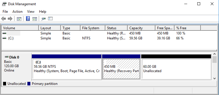 DISKPART> list volume Volume ### Ltr Label Fs Type Size Status Info ---------- --- ----------- ----- ---------- ------- --------- -------- * Volume 0 D DVD-ROM 0 B No Media Volume 1 C NTFS Partition 59 GB Healthy System Volume 2 NTFS Partition 450 MB Healthy Hidden DISKPART> select volume 2 Volume 2 is the selected volume. DISKPART> delete partition override DiskPart successfully deleted the selected partition.
