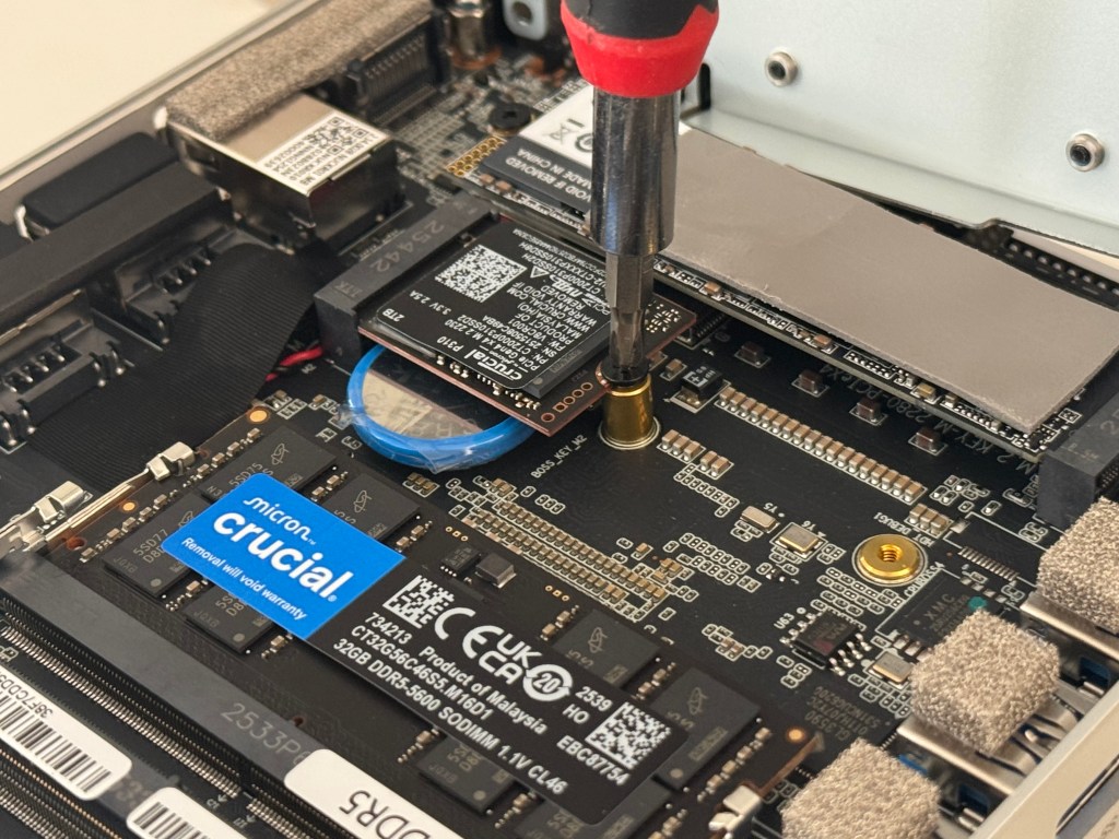 Driving the retaining screw into the standoff. The Crucial P310 is now lying flat and locked in.