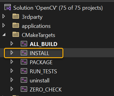 A second build procedure is required to generate the OpenCV distribution, required by any apps that want to use OpenCV. Expand the CMakeTargets folder in the solution explorer and build the INSTALL project.