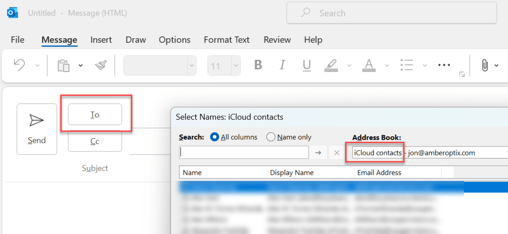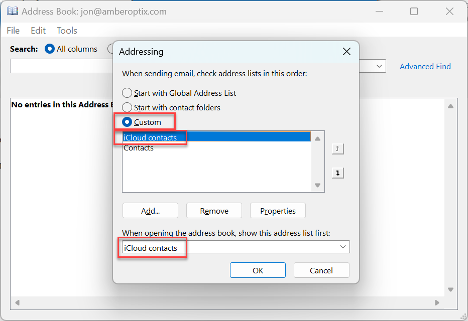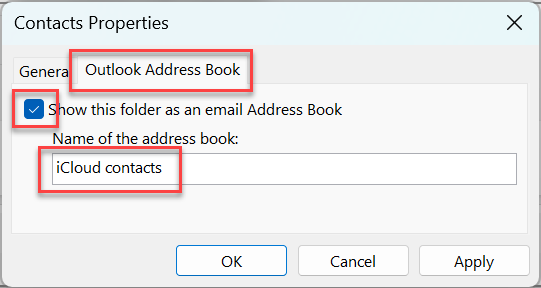 Right-click “Contact – iCloud”, select Properties, select the “Outlook Address Book” page, enable the option to show the folder as an address book, and change the name from the default “Contacts” to “iCloud contacts”: