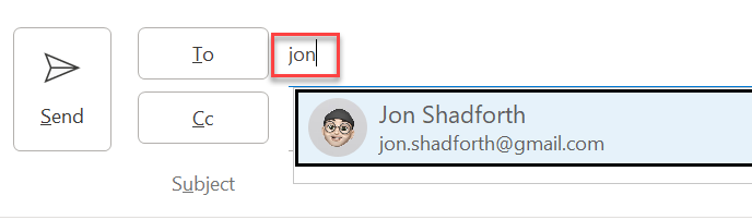 Tip: once an email has been used once from the list you can use start typing the person’s name in the To field and Outlook will auto-complete the entry: