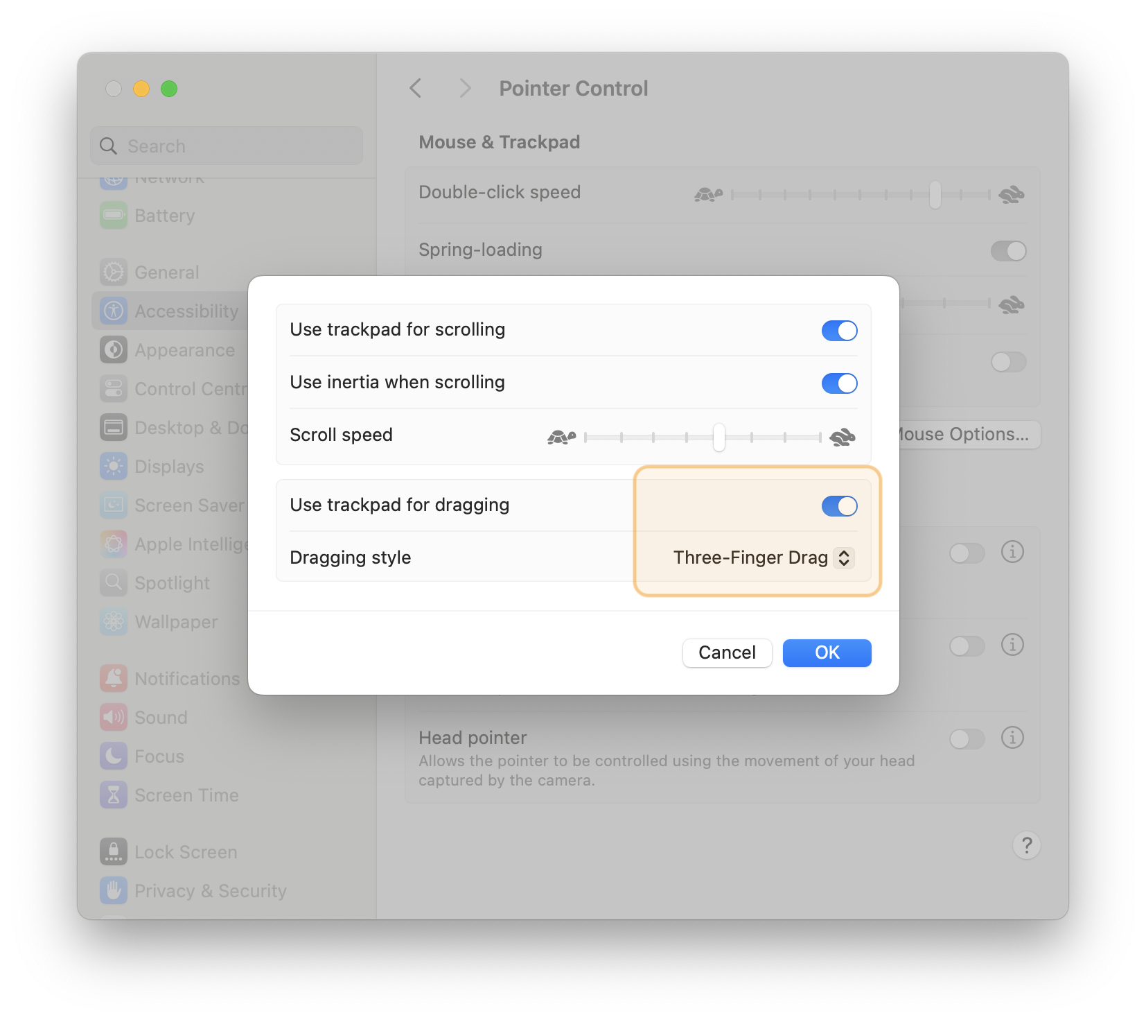 3-Finger Drag: Position your mouse over the title bar of a window and use three fingers to drag it effortlessly, no push required.
