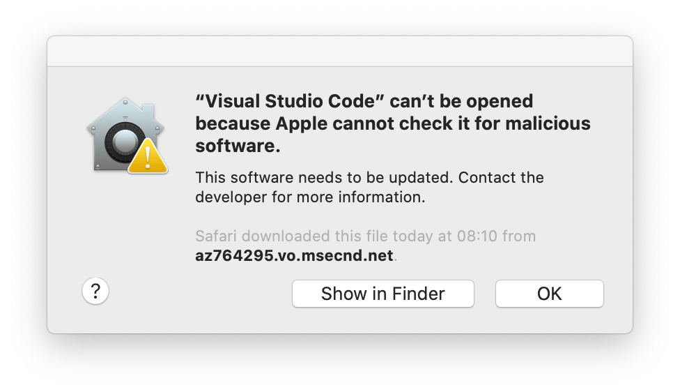 Close the message, open System Preferences, and select the Security and Privacy settings. Then select “Open Anyway” to allow VSC.